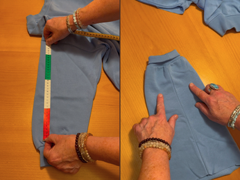 Halten Sie den zugeschnittenen Ärmel seitlich an Ihren Hund. Markieren Sie die Stellen, an denen die Löcher für die Vorderbeine sitzen sollen. Achten Sie darauf, dass die Position symmetrisch ist.