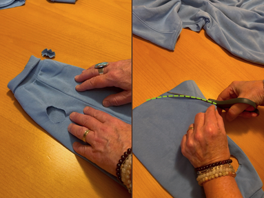Schneiden Sie vorsichtig kleine Löcher an den markierten Stellen in den Ärmel. Testen Sie, ob Ihr Hund genug Bewegungsfreiheit hat, und vergrössern Sie die Löcher bei Bedarf.